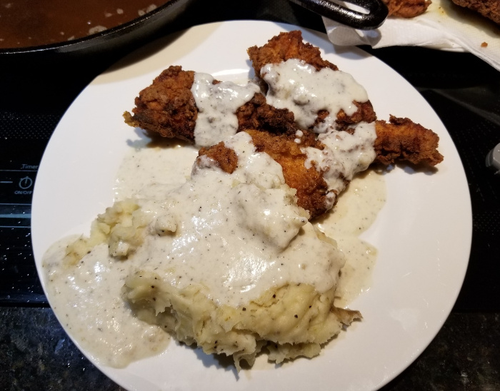 I’m looking at my old recipe. I see some things I’m not doing now. First of all, my last batch of chicken was made using eggs to hold the flour on. Paula Deen recommends this. My old recipe and Gordon Ramsay say to use buttermilk and no eggs.
